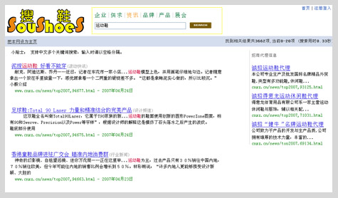 2007年4月19日由中國(guó)鞋網(wǎng)全力打造的專業(yè)鞋類搜索引擎:中國(guó)鞋業(yè)第一搜www.soushoes.cn(搜鞋網(wǎng))隆重上線,為鞋類行業(yè)提供更方便快捷的搜索服務(wù)