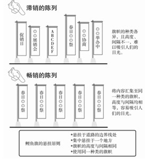 促銷廣告旗幟多是用來吸引駛過店鋪前方道路的司機們的,因此想要吸引人們的目光,必須做得簡單易懂。懸掛廣告旗幟的原則是只使用一種旗幟,同時整齊有序地保持相等的間隔。簡單地說,就是讓顧客反復看到同一種類的宣傳,從而加深顧客的印象,吸引顧客的目光。不要想著面面俱到,將想要表達的內容匯集至同一種宣傳工具即可達到滿意的效果。這一原則同樣適用于海報、廣告宣傳畫等。(中國鞋網-最權威最專業的鞋業資訊中心,)