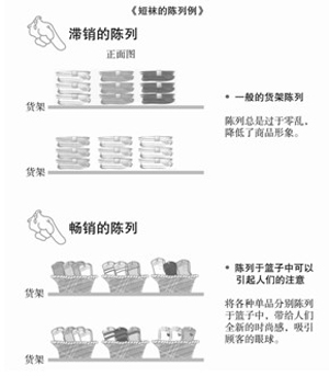 這只不過是一個簡單的例子,我們可以看出,僅僅是陳列方法的不同就能帶給顧客全新的商品形象。所以請不要拘泥以往的陳列方法,大膽地考慮新方法吧!