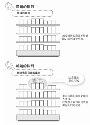 一旦創建了吸引目光的重點區域,不光是重點商品更加引人注目,整個陳列臺也會顯得層次分明、富有變化,其他商品的銷量也會有所增加。