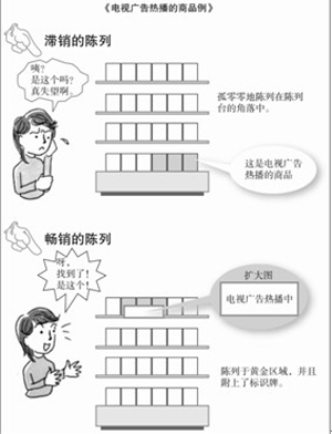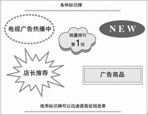 有些光臨店鋪的顧客是抱有對某種商品的期待感,特意來尋找這一商品的。比方說,電視廣告中熱播的商品。然而如果他們在店內找不到中意的商品,或是發現中意的商品孤零零地陳列于陳列臺的最下方,心情又會如何呢?想必顧客的興致馬上就一掃而光了吧。這是現實中經常發生的事情。廠商投入大量費用在電視廣告上,然而店內的工作卻沒能與其產生互動,無疑會拉銷售的后腿。所以新產品、宣傳中的產品、報紙廣告等廣告商品、媒體推薦的熱點商品一定要附上“標識牌”(參照圖4)。