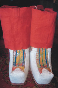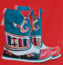 興頭上的強巴遵珠帶著我們參觀了工廠的陳列室,如數家珍地講起自己生產的一雙雙藏靴。他拿起一雙黃色緞面的高腰藏靴說:“這個鞋子叫‘甲青’,是漢語彩虹的意思,甲青是大的分類,它又分四個種類,比如,比這個用料更講究,用紅色面料的靴子,是當時的最高政教首領專用的。比這個低一點的,像這個黃顏色的,(由于西藏是佛教圣地)因為宗教上的意義,高僧大德們喜歡穿這樣的靴子,它的一個特點是鼻子翹起來,據說跑起步來不會跌跤(笑)。另外,甲青如果是一般俗官穿,這里有兩種,形狀不太一樣,一個是平底,一個是仰尖,這種鞋子應該是四品以上的官員才能穿。(他拿起另一雙鞋)那么這種平底鞋一般是地方政府的噶倫穿的,穿了這個鞋還要穿一種叫‘開克蘇’的官服,衣邊上鑲著綢緞,我小時候見過,這后面還有一種不同顏色的,像藍色的,墨綠色的,是過去地方政府的歌舞演員—噶珠們穿,所以也叫‘噶朗’。在過去,人們看某人所穿的鞋子就知道他的職業和地位。比如從宗教神職人員的角度,他們穿的這種鞋子叫“熱松”,基本上是宗教高層穿的,但也用綢緞,一般是用呢料。從我知道的角度講,比如布達拉宮朗杰扎倉,是各寺廟中地位很高的,他們中有人穿這種靴子。在有些寺廟,跳羌姆神舞的人也穿這個,做的非常漂亮。有人會問僧靴只有這幾種嗎,也不是,比如還有一種叫夏松,是僧人穿的,不是什么人都穿,只有某些寺院的僧人穿,它的前部是全用牛皮包起來的,比如像這個,有腰,然后前面包皮,作好了非常好看,但如果工藝不到家,在下雨淋濕后,干了,硬了,也會咯腳,腳上打泡。還有這個‘扎鞋(讀hai),也是非常有特色……”。