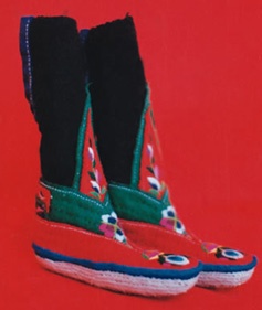 見到強巴遵珠,他給人的第一印象是為人精明,口才出眾,三句話不離本行。他從辦公室的展柜里拿出一雙精美的袖珍平頭花藏靴,滔滔不絕地講起了藏靴的特點和許多不為人知的奧妙。他說:“這是西藏婦女最喜歡穿的松巴鞋。這種鞋子叫松巴‘替尼瑪’,在松巴鞋中算好的,因為鞋幫上有這些復雜的花卉圖案,在舊社會是家庭條件好,出身高貴的婦女喜歡穿的,當然,現在一般老百姓都能穿得起了。比這種檔次低一點的鞋子叫‘松巴過不雜’,底子全部用牛皮包起來,原來是勞動婦女喜歡穿的。還有這種鞋子叫‘替日’,所謂替日,是專門用粗線納底,氆氌縫幫,多產于山南地區,在山南很多地區的農田邊有一種叫‘孫瑪熱雜’的植物,漢語叫大麻子、苧麻,農民們把它揪下扎成條縫進鞋底,然后把鞋底送到我們這里來精加工,再返銷給他們。這種鞋子的特點是比較暖和,經久耐磨,經水浸泡會越變越硬,變得更結實,深受農民朋友的歡迎……而在廣大的牧區,牧民喜歡自己縫鞋,比如像這個,叫‘志朗’,意思是產自康區甘孜‘志霍’地方的靴子,我們閉著眼睛一摸就能知道是它,老一輩人管它叫霍爾鞋。還有這種‘珠西替雜’鞋,青海玉樹人喜歡穿,我們過去賣了很多,坐大貨車去賣的,他們說這種鞋很結實,在雪地上走路也不會變形。”