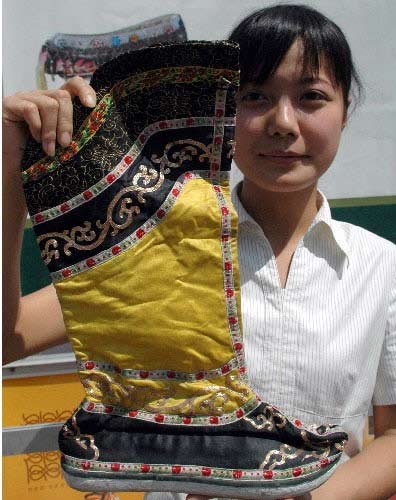 一位工作人員在展示“清代皇帝靴”