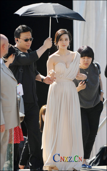 中國鞋網05月14日訊,法國戛納,第63屆戛納電影節,主競賽單電影《日照重慶》(Chongqing Blues)記者會舉行后,范冰冰迅速換上一身不對稱設計褶皺LV白裙和高跟鞋為接下來的采訪做準備。范冰冰這套禮服大走“希臘女神”風,大秀乳溝胸前春光無限。