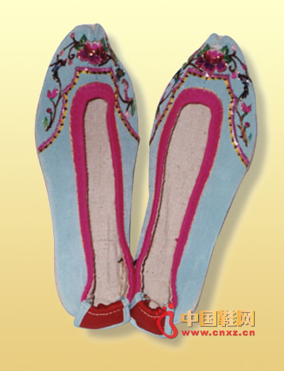 【-鞋文化】壯族是我國(guó)人口最多的少數(shù)民族,主要聚居在廣西壯族自治區(qū)。壯族是居住在嶺南的土著民族,以前自稱為"布?jí)?quot;、"布儂"等,在服飾、風(fēng)俗習(xí)慣等方面仍然保留著濃厚的民族風(fēng)韻。這里展出的是壯族婦女日常穿用的"喜鞋"。這種"喜鞋"也在結(jié)婚場(chǎng)合穿,鞋面上有"喜"字或喜鵲、梅花等圖案,寓意吉慶喜氣。鞋尖為三角錐狀,呈"回頭"狀。鞋面為藍(lán)布,上有用紅、金、綠線繡成的花草圖案。鞋底為用麻線納的千層底,針腳細(xì)密,堅(jiān)固耐穿。