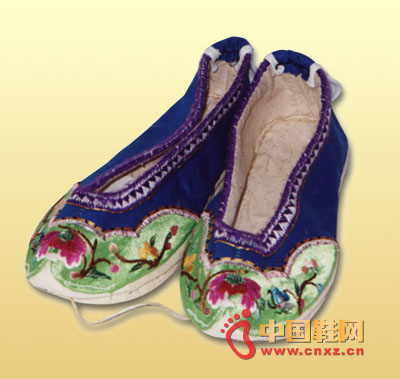 【-鞋文化】侗族自稱"更"、"君"或"金",漢族稱之為"侗家"或"侗人"。主要從事稻作,素有"水稻民族"之稱。您所見到的是侗族女子穿用的繡花鞋,該鞋為千層底,用棉線納成,鞋頭為雙梁尖頭,整個鞋面由藍布和紅布拼接而成,在鞋的前部繡有抽象幾何紋,并在中間綴有亮片;鞋后跟用槳過的黑布縫成勾云紋。