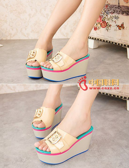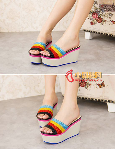 水鉆牛皮松糕厚底拖鞋,別致的坡跟涼鞋,拼接魚嘴的設計十分獨特。