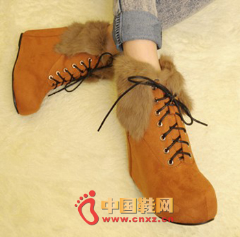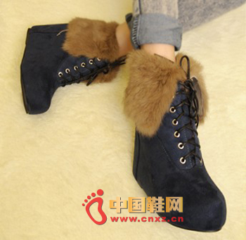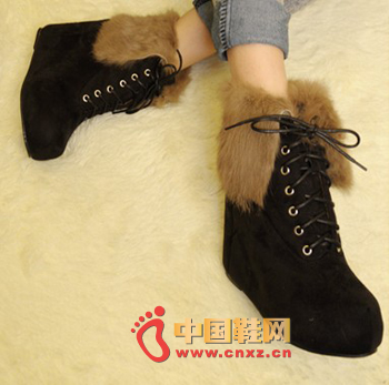 2012年冬季絨面坡跟短靴,坡跟設計,拉長腿型,顯瘦美腿的秘密武器。鞋身采用細膩的絨面,皮草的裝飾很奢華很高貴,體現了休閑與華麗的范兒。