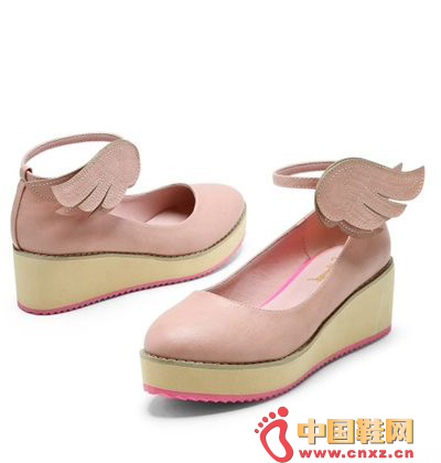 糖果色的粉紅厚底鞋,與熒光色進行拼接,給人與眾不同的感覺,美麗天使的翅膀點綴在日常穿的鞋面上,更是夢幻一般的感覺!