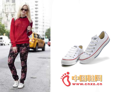 花式印花長褲是今年流行元素,再搭上一雙白色帆布鞋,多種不同元素的單品混搭出別樣的時尚風味,成為全場焦點。