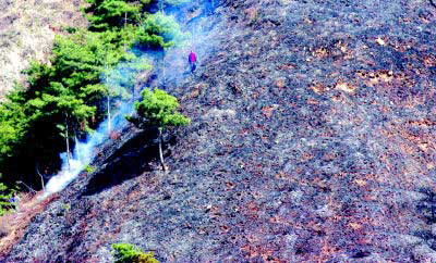 下午1時40分左右,大火蔓延過山坡后,過火的山坡已成了一片黑色的焦灰,當地林業、公安等部門約300人已切斷山坡上的“火引子”,將著火范圍控制住。