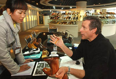 12月12日,溫州哈杉鞋業(yè)有限公司美國公司副總裁尼爾·馬克斯(右)在與公司員工分析目前流行歐美市場(chǎng)的新款皮鞋式樣。