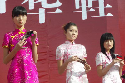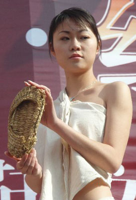 模特正在展示中國(guó)古代的“三寸金蓮”(小腳鞋)