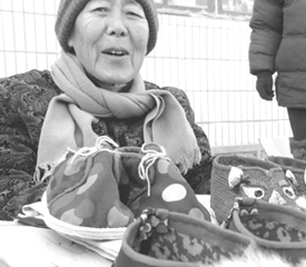 2月5日,在沾化縣下洼鎮(zhèn)永豐集貿(mào)市場(chǎng)上,一位老人的手工制品老虎鞋十分俏銷,每雙能賣到10元左右。