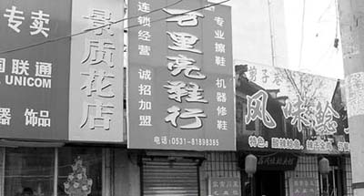 據(jù)對面小賣部的老板說:“這家鞋行在十二馬路有一家總店,不過那家也關(guān)了門,找不到人了!庇浾咴囍鴵艽蛐袕V告牌的加盟電話,但話筒里傳來的是“你撥打的電話已關(guān)機(jī),請稍后再撥”。