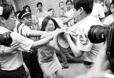城管等執(zhí)法人員與女?dāng)傊靼l(fā)生肢體沖突。昨日,大柵欄工商所、城管和公安等部門對(duì)前門煤市街地區(qū)進(jìn)行突擊檢查。查抄一處無照經(jīng)營(yíng)的鞋攤時(shí),一名城管隊(duì)員胳膊被女?dāng)傊鲹蟼被找脖怀断拢當(dāng)傊鲃t赤腳躺倒在地。最后,在警察和工商等執(zhí)法人員的勸說下,女?dāng)傊髯弦惠v警車離開現(xiàn)場(chǎng)。執(zhí)法人員共取締了兩家煙酒鋪、兩家飯館、一家話吧和一家鞋攤,這些商鋪均為無照經(jīng)營(yíng)。