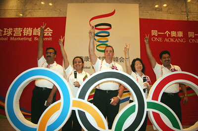 代表世界五大洲的5位來自不同國度的奧康海外員工托起奧運(yùn)五環(huán),并向全世界發(fā)表《夢想宣言》:發(fā)揚(yáng)奧運(yùn)精神,成就世界品牌。6月18日,中國最大的民營制鞋企業(yè)奧康集團(tuán)在溫州舉行“同一個(gè)奧康·同一個(gè)夢想”奧康全球營銷峰會,以一種別具一格的方式宣告奧康新全球營銷戰(zhàn)略的啟動。