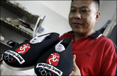 2007年8月7日,中國北京,在臨近奧運一周年之際,四位京城老字號“內聯升”的師傅們為慶祝奧運一周年特制了一雙獨一無二千層底布鞋,向北京奧運送祝福。
