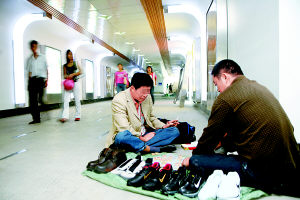 9月17日,兩名商販在烏魯木齊市小西門地下通道內擺攤賣鞋子。