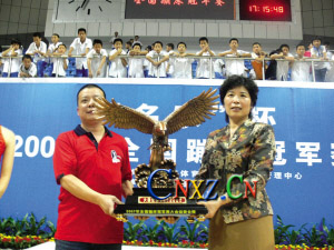 全國蹦床冠軍賽組委會為丁思亮頒發紀念獎杯