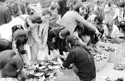 10月14日,杭城上萬市民和外來務工人員趕了一回買“水貨”鞋子的大集,他們來到華浙廣場購買被大水淹過、受潮的便宜鞋子。當天,杭州華貿鞋城的經營戶們把整箱整箱遭臺風“羅莎”帶來的大水淹過、受潮鞋子拿來賤賣,價格出奇的便宜,從10元至100元不等,讓消費者著實淘了一回“寶”。