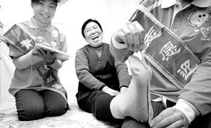 圖為宣武區(qū)內(nèi)聯(lián)升志愿服務(wù)隊(duì),昨天在大柵欄街道煤市街東社區(qū), 為長(zhǎng)期照顧的71歲空巢老人高秀存現(xiàn)場(chǎng)量腳并制作布鞋 攝/記者饒沛