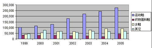 1999 - 2005鞋產(chǎn)品出口種類 單位:1000雙