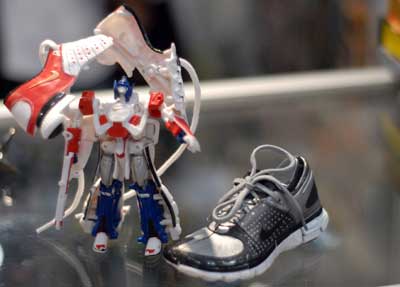 隨著電影《變形金剛》的火爆,打起變形金剛主意的商家可不在少數(shù),一運(yùn)動(dòng)些品牌與一玩具商共同推出了運(yùn)動(dòng)鞋版變形金剛,讓人瞠目結(jié)舌。該玩具展開來是個(gè)變形金剛,收起來則是個(gè)鞋子的造型,其收藏價(jià)值與娛樂精神自然不可小覷。