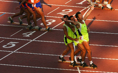 廣州,2007年11月11日 [民族運動會·快訊](1)板鞋競速――湖北隊奪冠 11月11日,湖北隊隊員孫津俊、朱任威、趙飛(從右至左)在男子板鞋競速60米決賽沖過終點后慶祝勝利。當日,在第八屆全國少數(shù)民族傳統(tǒng)體育運動會板鞋競速男子60米決賽中,湖北隊以10秒30的成績奪得金牌。 板鞋競速在廣西壯族自治區(qū)少數(shù)民族中較為盛行,在本屆民族運動會中首次被列為比賽項目,湖北隊成為首枚板鞋競速項目的金牌得主。