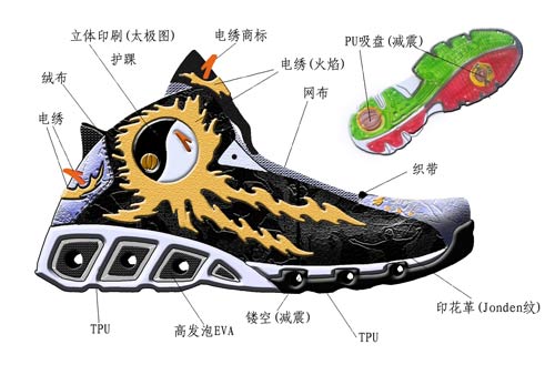 “戰(zhàn)靴之魂”被網(wǎng)評(píng)認(rèn)為是目前戰(zhàn)靴組較為突出的一個(gè)作品。它充分使用諸多中國(guó)文化元素:將鞋幫近腳踝處的圖案設(shè)計(jì)成一個(gè)立體印刷(四大發(fā)明之一)的太極圖,而太極圖中的陰陽球分別代之以安踏LOGO和籃球標(biāo)識(shí),寓意安踏和CBA輝煌的合作;還用現(xiàn)代電繡技法讓中國(guó)哲學(xué)中頗具霸氣和力道的火焰布滿了鞋面,以象征繁榮和升華;為了透氣,作品在鞋身上面用網(wǎng)布;為了舒適,鞋后幫里用絨布;為了減輕重量,鞋底采用鏤空造型和高發(fā)泡EVA及TPU材質(zhì);而為了防滑,鞋底面上作者自創(chuàng)了“方圓”減震紋路系統(tǒng),而“方圓”減震底紋的靈感同樣源于太極圖。