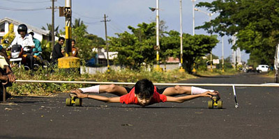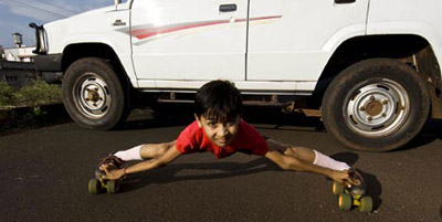據(jù)英國(guó)《每日郵報(bào)》今日?qǐng)?bào)道,按常理來(lái)說(shuō),穿旱冰鞋從底下鉆過(guò)汽車(chē)似乎是不可能的,但印度6歲男孩阿尼克特·陳達(dá)克卻做到了這一驚人舉動(dòng),創(chuàng)了一項(xiàng)非官方"練獄溜冰"世界紀(jì)錄——穿旱冰鞋45秒內(nèi)一口氣順利鉆過(guò)57輛汽車(chē)。