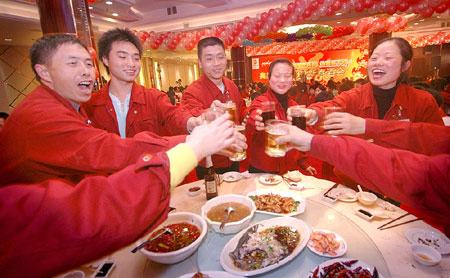 據(jù)了解,每逢歲末為員工擺“分歲酒”多年來一直是溫州眾多民營企業(yè)關(guān)愛農(nóng)民工的良好傳統(tǒng)。作為溫州民營企業(yè)代表之一的奧康集團(tuán),其分歲酒活動(dòng)自1998年啟動(dòng)至今已持續(xù)了10年,而今年則是規(guī)模最大的一次。