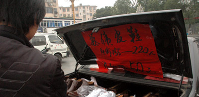 昨日下午3時,記者路過省城象山文化廣場看見,一輛牌照為贛AH9682的小車,利用車子的后備廂做“櫥窗”,紅底黑字的“抵債皮鞋”像招牌一樣,貼在后備廂蓋子上。旁邊年輕的“店主”非常熱情,在廣場一邊轉悠一邊吆喝,引來不少市民圍觀。