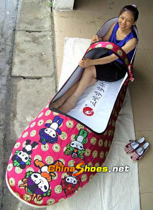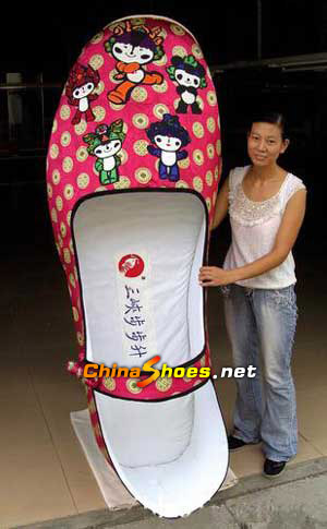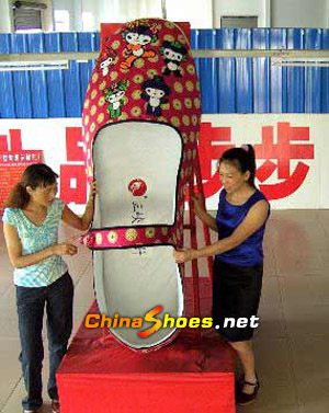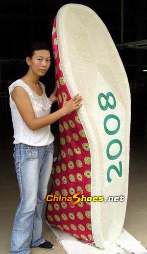 湖北宜昌市一鞋業公司的工人在展示長2008毫米的“2008奧運手工布鞋”。“2008奧運手工布鞋”由一只寶藍色男式鞋和一只紅色女式鞋組成,男式鞋上面繡有北京奧運會會徽,女式鞋上繡有“福娃”圖案,鞋底均上繡有“2008”,分別于2007年1月和8月制作完工。