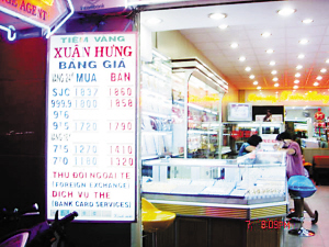越南一家金店內(nèi)顧客寥寥,金店門前廣告牌上寫著當(dāng)天的金價(jià)。 時(shí)報(bào)特派記者 張配吉 林燕輝 攝