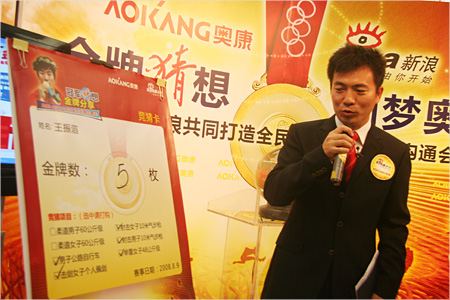 8月4日,在北京奧運大幕即將拉開之際,以“金牌猜想,圓夢奧運”為創意,中國最大民營制鞋企業奧康集團在溫州宣布聯手全球最具影響力中文門戶網站新浪網打造了一個全民奧運賽場,為實現全民關注奧運、參與奧運、支持奧運提供了一個互動平臺。只要你輕松猜一猜,也能拿“金牌”,讓你全身心感受到奧運比賽的刺激、緊張、榮譽。