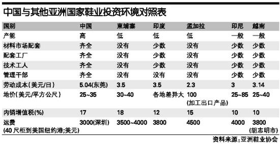 中國與其他亞洲國家鞋業投資環境對照表