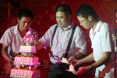 總裁王振滔連同兩名員工切蛋糕慶生.