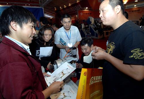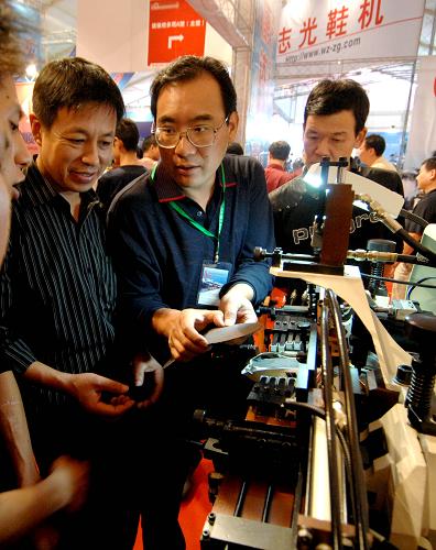 10月26日,采購商和制造商在洽談生意。當日,第八屆中國(溫嶺)鞋類、鞋材及設備展覽會在浙江溫嶺開幕,溫嶺國際鞋料城也同時開業。2008年,溫嶺市制鞋產業積極開拓國內外市場,在宏觀政策從緊、國際經濟波動、要素制約加大等眾多壓力下仍保持一定增長。1至7月,規模以上鞋業企業實現工業產值45.44億元,同比增長8.7%,實現銷售產值44.34億元,同比增長9.1%。 新華社記者 王小川 攝