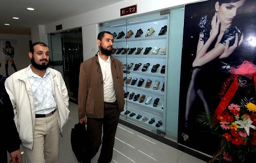 10月26日,來自中東的采購商在溫嶺國際鞋料城采購商品。