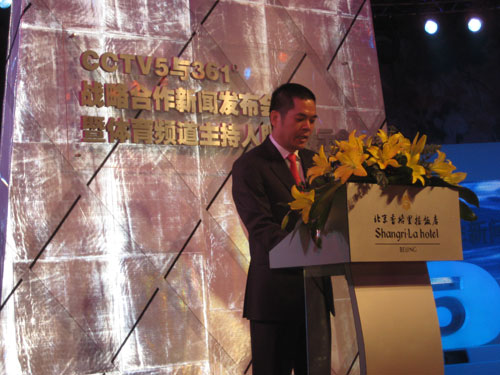 11月28日,CCTV5與361度(中國(guó))有限公司在北京香格里拉酒店舉行了隆重的簽約儀式。2009年1月1日起,CCTV5所有主持人及出鏡記者都將穿著361度公司提供的服裝。作為中國(guó)創(chuàng)辦最早、規(guī)模最大、擁有世界眾多頂級(jí)賽事中國(guó)大陸地區(qū)獨(dú)家報(bào)道權(quán)的專業(yè)體育頻道,中央電視臺(tái)體育頻道與361度公司共同攜手,以全新形象展現(xiàn)在世界面前。中央電視臺(tái)體育頻道總監(jiān)江和平和361度(中國(guó))有限公司總裁丁伍號(hào)先生共同出席了新聞發(fā)布會(huì)。