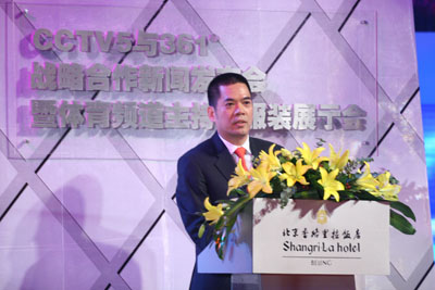 11月28日,三六一度(中國)有限公司與CCTV-5在香格里拉酒店舉行了隆重的簽約儀式。自2009年1月1日起CCTV-5所有主持人及出鏡記者都將穿著361°公司提供的服裝。作為中國創(chuàng)辦最早、規(guī)模最大、擁有世界眾多頂級賽事中國大陸地區(qū)獨家報道權(quán)的專業(yè)體育頻道,CCTV-5將在361°公司的裝扮下,以全新形象展現(xiàn)在世界面前。中央電視臺體育頻道總監(jiān)江和平先生和三六一度(中國)有限公司總裁丁伍號先生共同出席了新聞發(fā)布會。