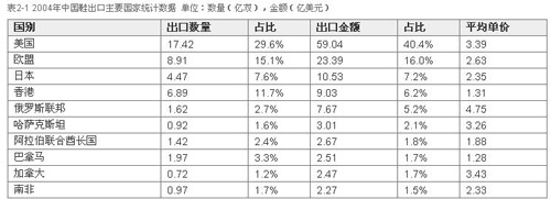 表2-1 2004年中國鞋出口主要國家統計數據 單位:數量(億雙),金額(億美元)