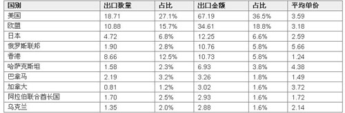 表2-4 2007年中國鞋出口主要國家統計數據 單位:數量(億雙),金額(億美元)