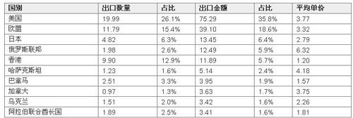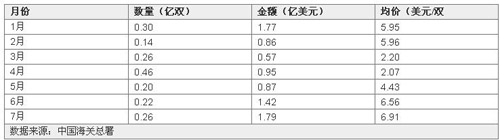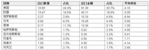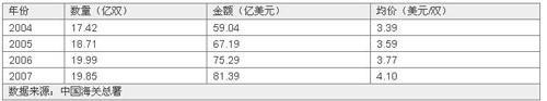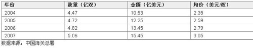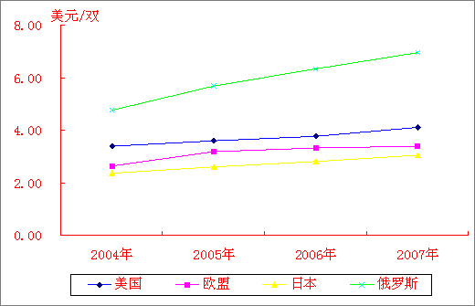 中國鞋類在俄羅斯進口市場居第一位,主要以中低檔產品為主,平均售價在10美元/雙以下;俄羅斯是意大利鞋的第二大出口市場,進口量僅次于日本,意大利鞋在俄羅斯的平均售價高于30美元/雙。表2-12、2-13和圖2-7為2004年至2008年7月份中國鞋類產品對俄羅斯出口數據統計: