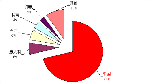 美國從中國、意大利、巴西、越南和印尼的進口量分別為19.5億雙、7994.7萬雙、6792.1萬雙、4747.4萬雙和2779.5萬雙,分別占到2005年美國成品鞋進口總量的85.3%、3.5%、3.0%、2.1%和1.2%。其中從中國、越南和印尼的進口量與2004年相比分別增長了8.6%、43.5%和1.5%,從巴西和意大利的進口則下降了19.2%和20.7%。圖2-1為美國鞋類產品主要進口國家: