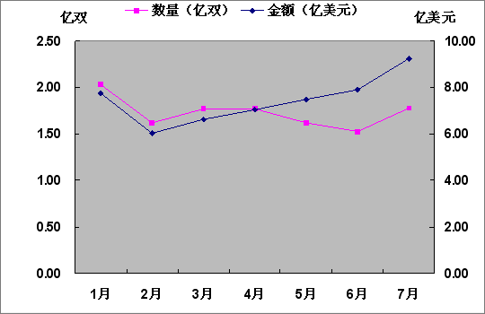 圖2-2 2008年1-7月份中國鞋出口出口數量和出口金額走勢圖
