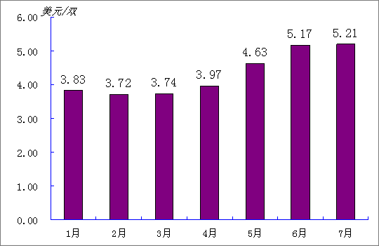 圖2-3 2008年1-7月份中國鞋出口美國市場出口均價變化情況