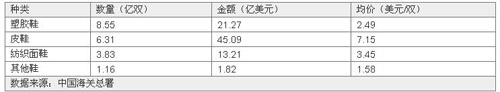 就美國鞋類產品進口種類而言,皮鞋所占比例最大,進口量為9.3億雙,進口金額為122億美元,占整個鞋類產品進口額的63.5%;其次是塑膠鞋,進口量為9.9億雙,進口金額為44億美元,占整個鞋類產品進口額的22.9%;紡織面鞋進口量為4.4億雙,進口金額為21億美元,占整個鞋類產品進口額的10.9%。